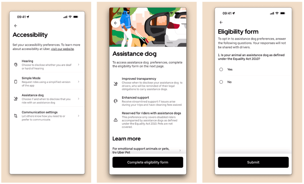 People with assistance dogs now have the option to self-identify within the Uber app, which can automatically inform drivers that they are traveling with their assistance dog.This supports a smoother experience from pickup to drop-off by enabling clearer communication for both riders and drivers throughout their journey. It will also offer riders proactive support if something goes wrong along the way.