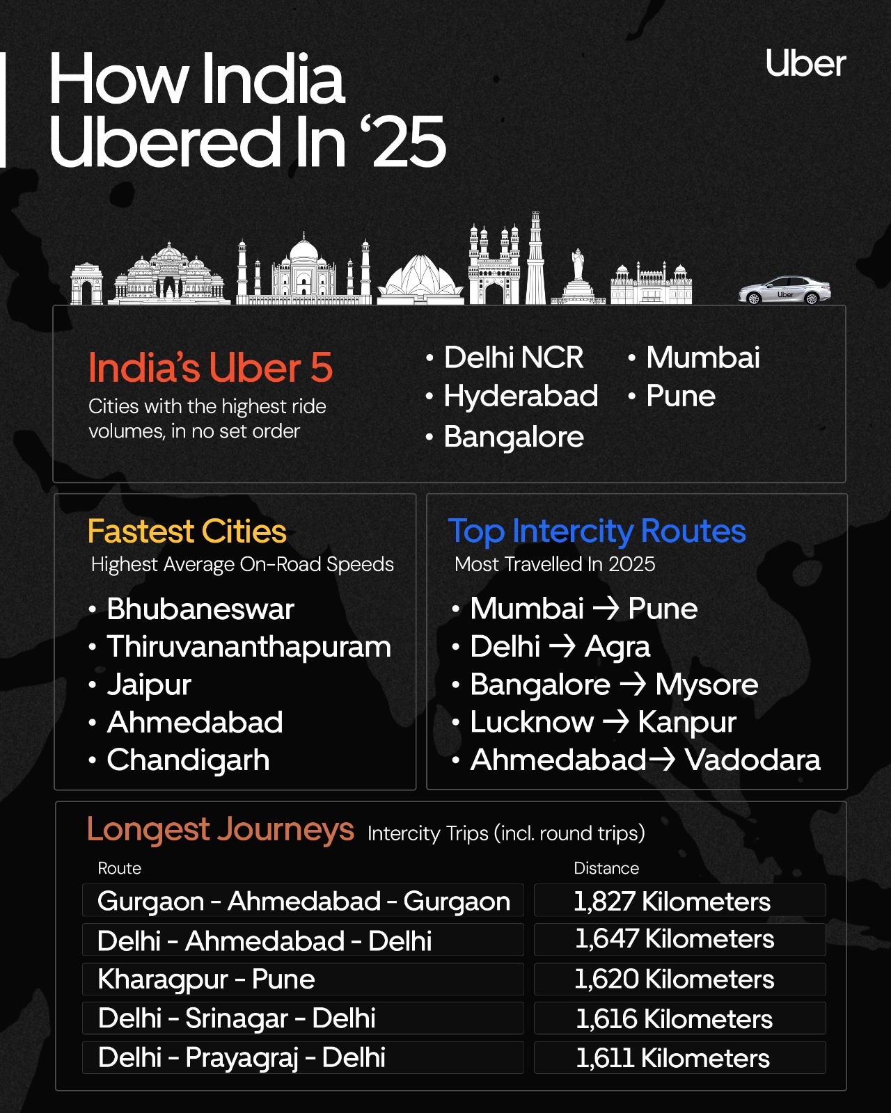 In 2025, Indians Ubered more than ever before, building on last year’s momentum and setting fresh benchmarks for mobility. Collectively, Uber trips spanned over 11.6 billion kilometers during the year. To put this into perspective, that’s over 3.2 million trips from Srinagar to Kanyakumari in the year, or 8,840 times every single day.