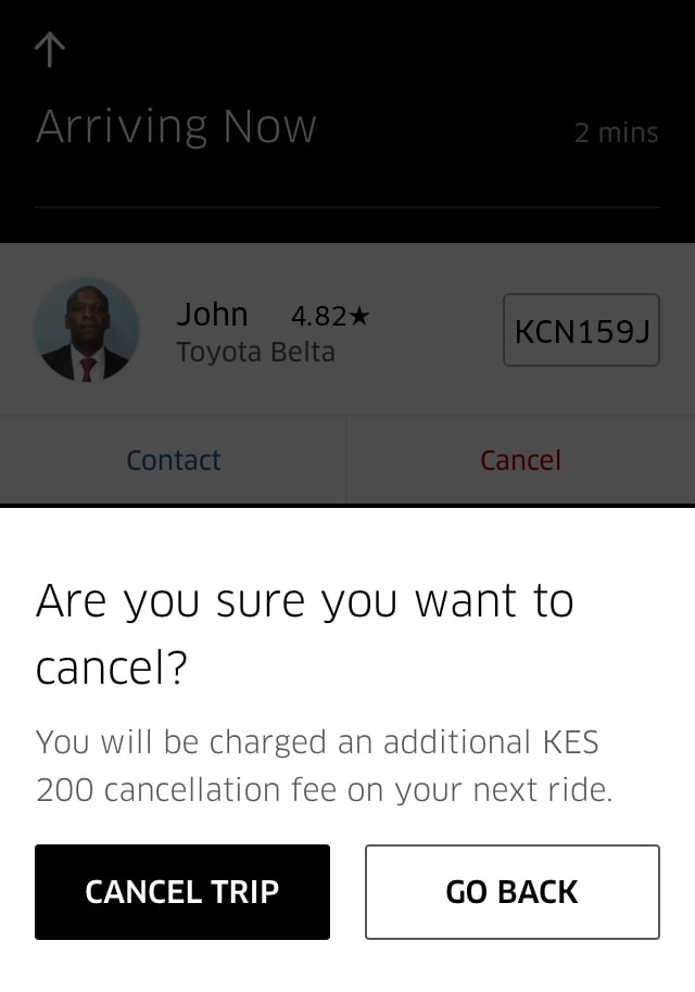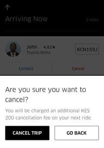 Before you cancel a cash trip, you will receive the following notification to ensure that you are aware of the fee that will be added to your next trip: