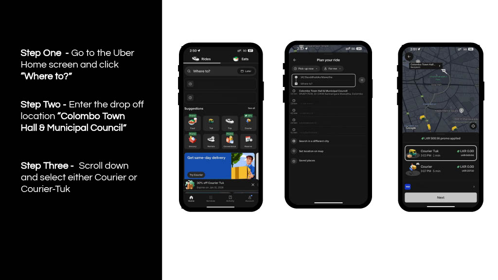 We are facilitating donation pick-ups in Colombo through the Uber app, with all items delivered to the central collection point set up by CMC at the Colombo Town Hall. Sri Lankans can participate in the donation drive by following these steps: