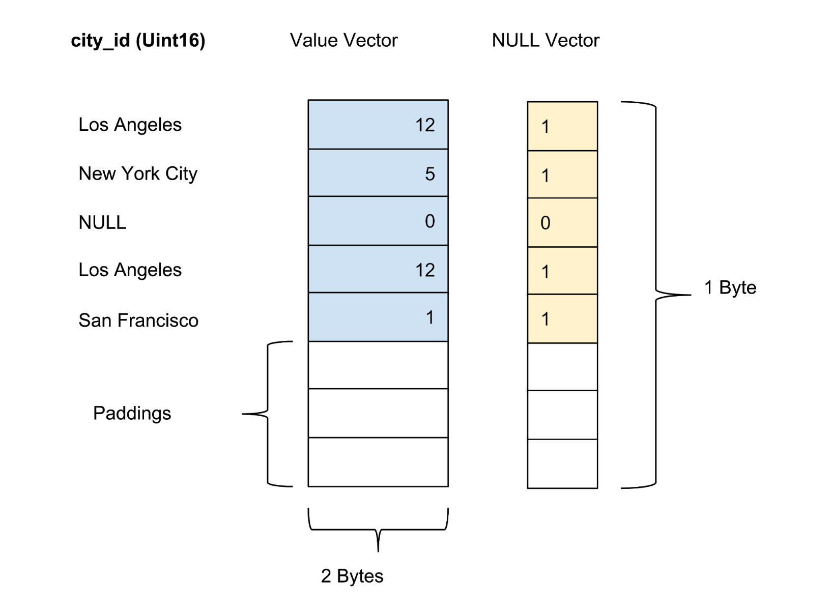 The values of each column within a batch are stored as a columnar vector. Validity/nullness of the values in each value vector is stored as a separate null vector, with the validity of each value represented by one bit. In Figure 4, below, we offer an an example with five values for a city_id column:
