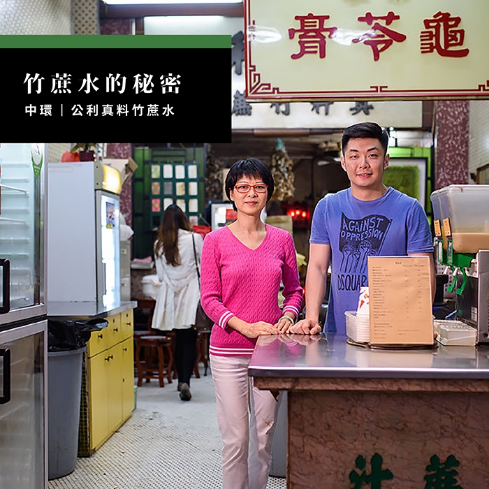 「用一般黑蔗榨出來的竹蔗水會燥熱,多喝無益,所以即使工序較多,我們都堅持使用較甜潤溫和的綠色肉蔗。」現在跟爸爸和大哥一同打理涼茶舖的第四代傳人崔文斌道。「公利」對於處理肉蔗的確有一份執着。一般小食店為了節省時間,榨汁前不會刻意再蒸熟竹蔗及去皮,但竹蔗即使是每天新鮮運到,其實都需要先蒸熟殺菌才適合飲用。去皮亦可去除竹蔗的草青味,榨出來的蔗汁就會更濃郁,蔗味更香。所以「公利」一直以來在榨汁前都堅持先把竹蔗去皮蒸三小時,再放涼四至五小時,才放進榨汁機榨成竹蔗水,以確保食客今天都能飲得到六十年前的傳統味道。