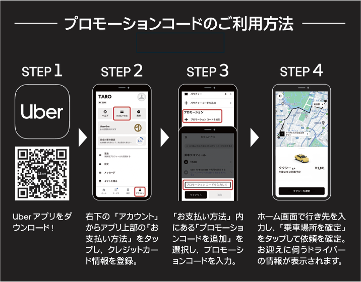 - 利用条件:プロモーションコード【PGA25UBER】をアプリ内で入力のうえ、Uber Taxi の配車を完了すること