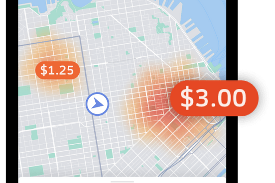 マップ上でピーク料金ゾーンを探します。ピーク料金ゾーンは需要に基づきリアルタイムで更新されるため、昼食時や夕食時、天候の影響で注文が増えるときによく表示されます。