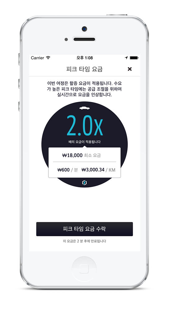 피크 타임 요금이 적용되는 경우 이러한 가격 변화에 대해 모든 이용자가 확인할 수 있도록 앱상에 공지가 뜨고 픽업을 요청하기 전 새로운 요금을 수락해야 합니다. 또한, 앱의 요금 견적 기능을 통해 피크 타임 요금이 적용된 예상 요금을 확인할 수 있습니다.