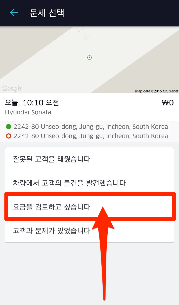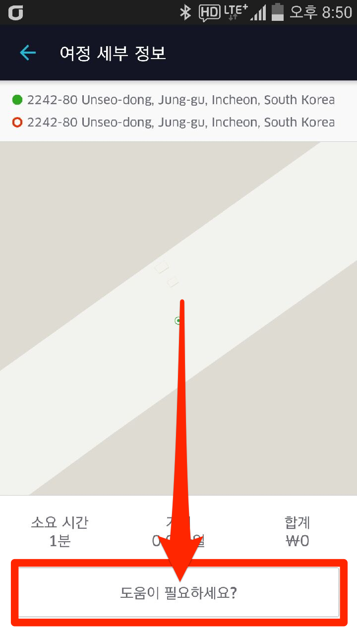 만약 해당 여정에서 요금을 잘못 입력하셨다면 여정이 끝난 직후 “도움이 필요하세요?” 누르십니다.