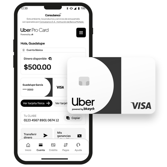 La aplicación Uber Pro Card es propiedad de Consubanco S.A. Institución de Banca Múltiple (Consubanco), empresa autorizada por la Comisión Nacional Bancaria y de Valores para constituirse y operar como Institución Financiera de Banca Múltiple, enfocada a ofrecer servicios bancarios y financieros. Las cuentas de ahorro y los depósitos son operados exclusivamente por Consubanco. Consubanco está autorizado para utilizar la marca registrada Uber Pro Card.