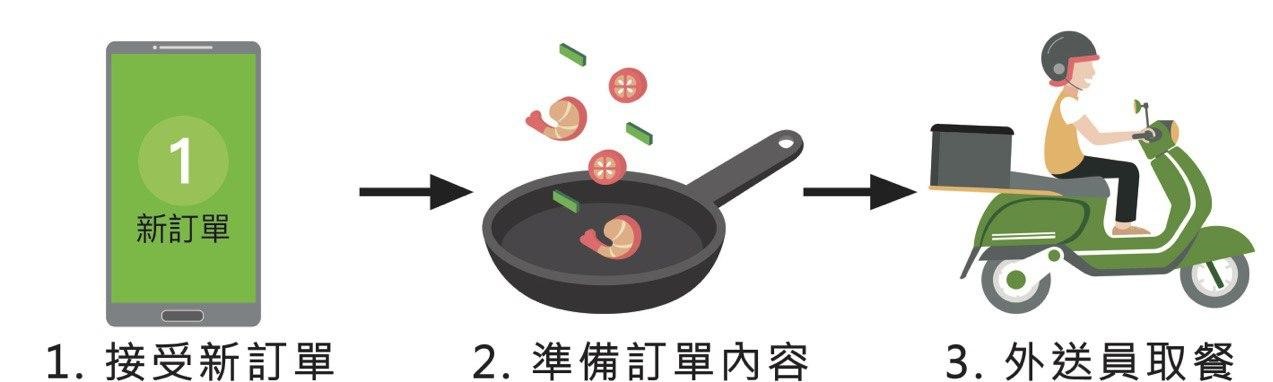 3.外送員取餐:系統將於預計取餐時間前五分鐘開始配對合作外送夥伴,請與合作外送夥伴核對訂單編號後再遞交餐點。