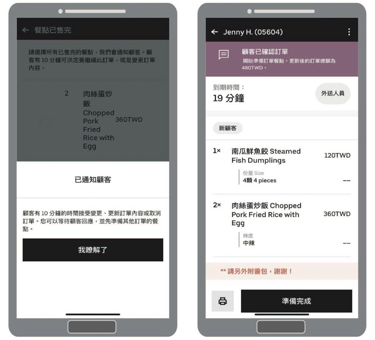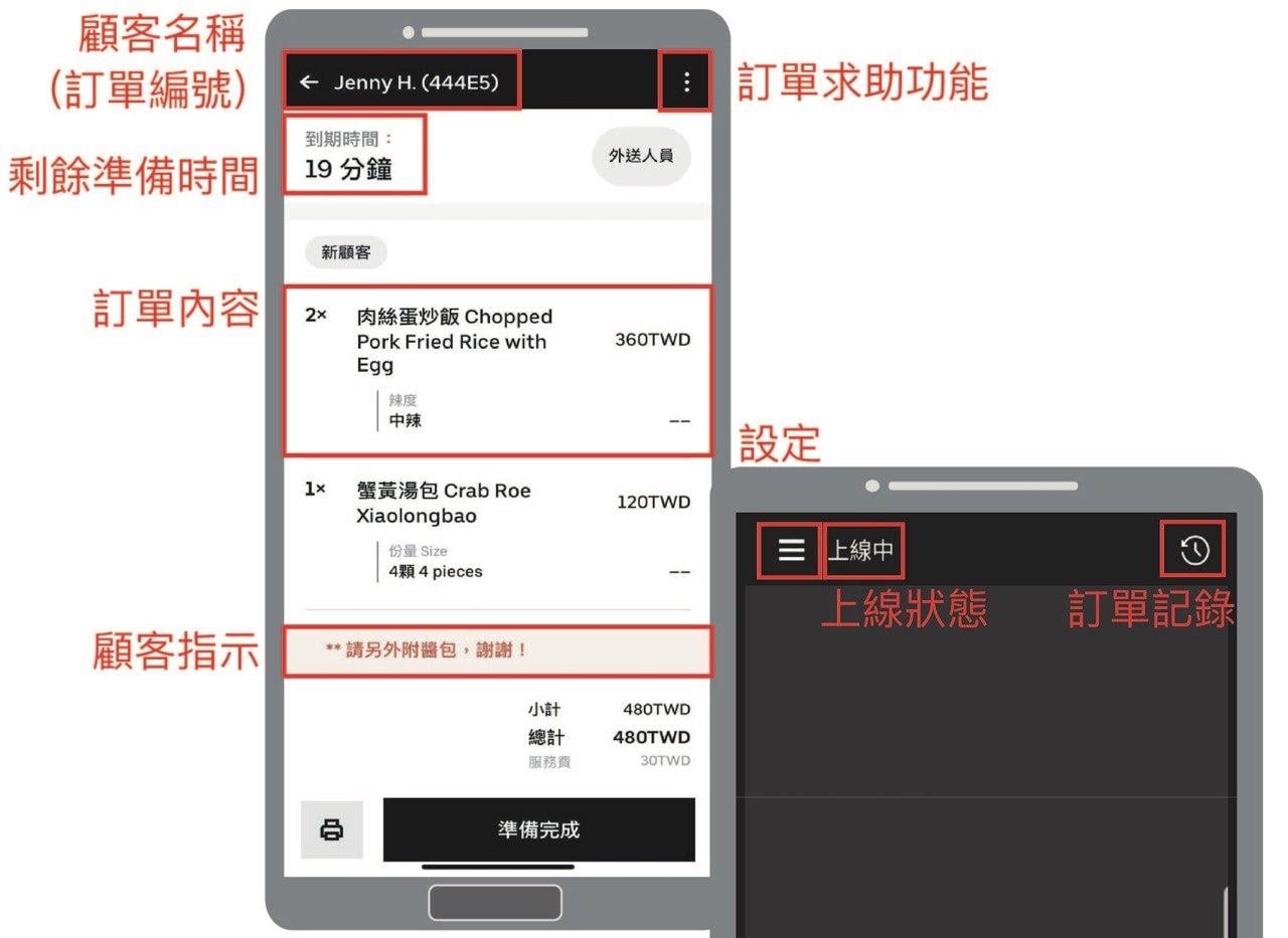 2.準備訂單內容:確認完訂單內容後,請於訂單畫面左上方預計取餐時間內完成備餐,如有需要可善用訂單求助功能。