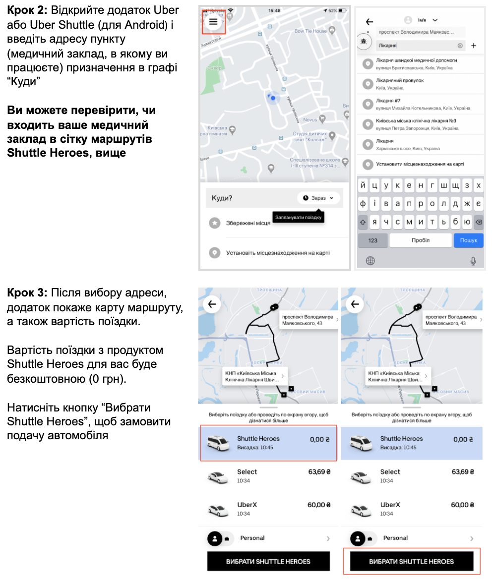 Відсьогодні Uber Shuttle розпочинає новий формат роботи на період карантину. Сервіс Shuttle Heroes працюватиме абсолютно безкоштовно та надаватиме маршрути для працівників підприємств критичної інфраструктури Києва. Ми оноволи маршрути, щоб забезпечити сполучення більшості районів із основними медичними закладами нашого міста та іншими стратегічними підприємствами.