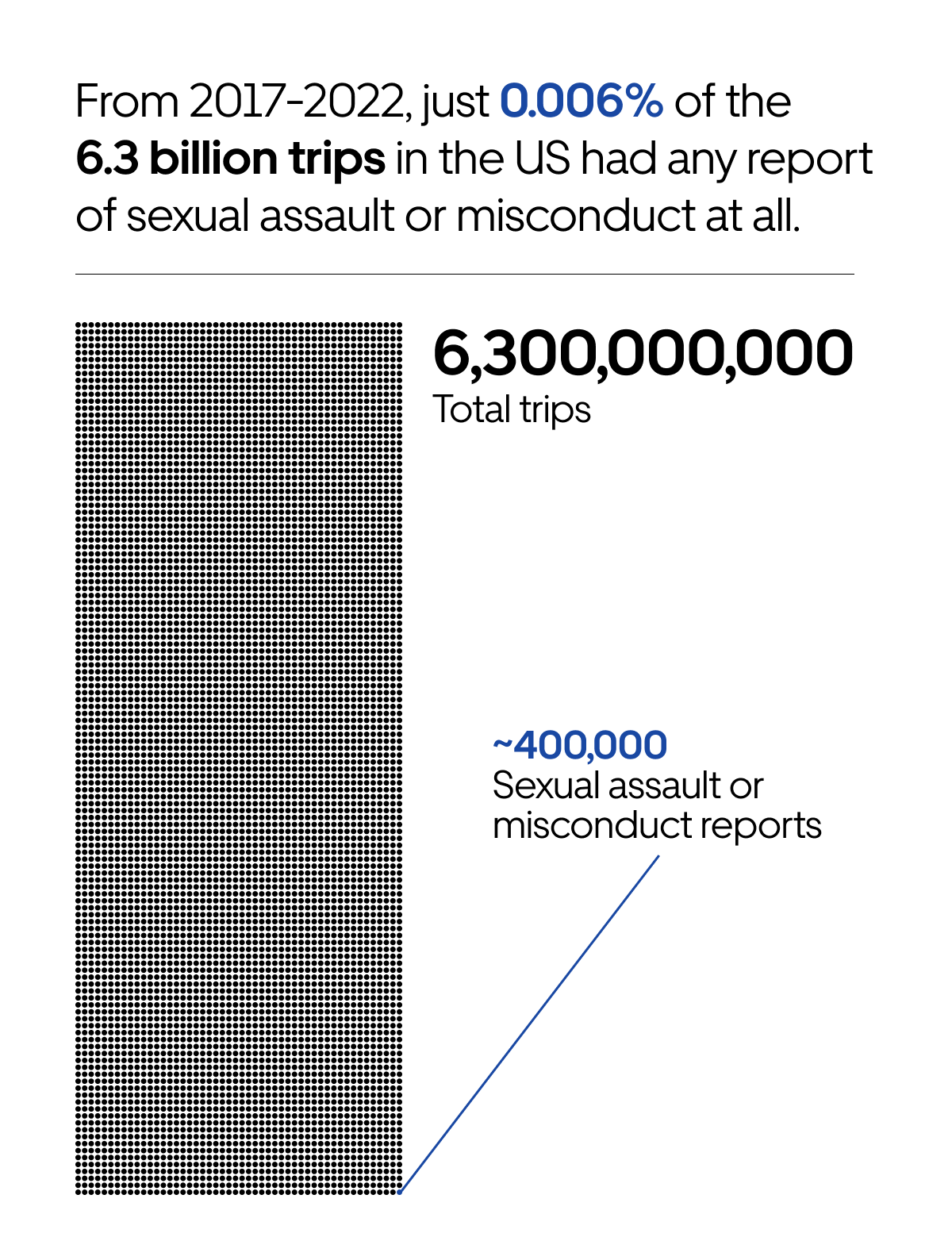Finally, these reports were exceptionally rare: during that same time period, 6.3 billion Uber trips took place in the United States, meaning all of the reports amounted to just 0.006% of total trips. The most serious reports were even rarer, at 0.00002%, or 1 in 5 million, of all trips.