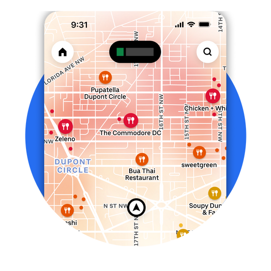 The delivery heatmap now gives you a real-time view of where demand is heating up with color-coded areas and updated icons refreshed every 10 minutes. Find hot spots faster, and maximize your earning potential.