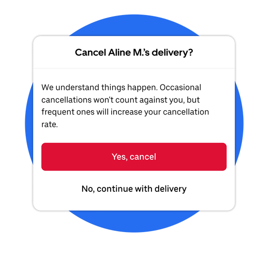 Couriers are now protected from occasional cancellations that are beyond your control—such as when someone else picks up your order or a restaurant is unexpectedly closed—and they won’t count toward your cancellation rate. Improved communication in the app will help you make informed decisions when cancellation issues arise.