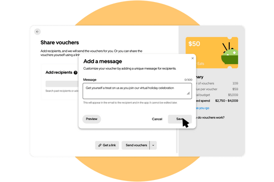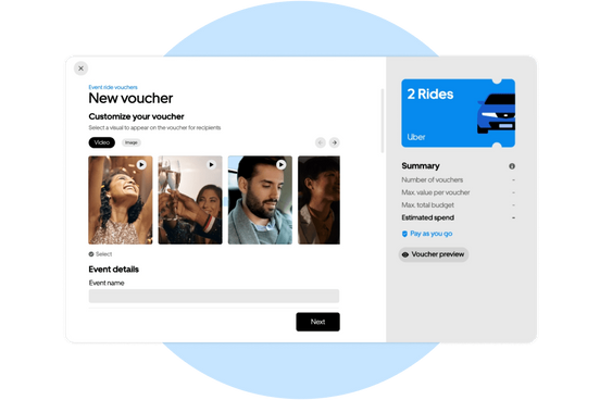 借助代用券,您可以向员工或 客户发放优步消费金,并且可以控制其使用方式(例如设置到期日期、使用地点限制和其他条件)。例如,您可以选择为特定活动或在工作时段内提供乘车或订餐消费金。此外,使用代用券时,您只需为消费的金额付款,只有在接收者兑换代用券时才会产生费用。