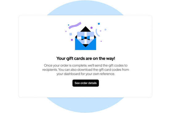 礼品卡在购买当天即可供下载。在操作面板中即刻查看已完成的订单。当您的礼品卡可以分发时,您还会收到一封确认电子邮件。