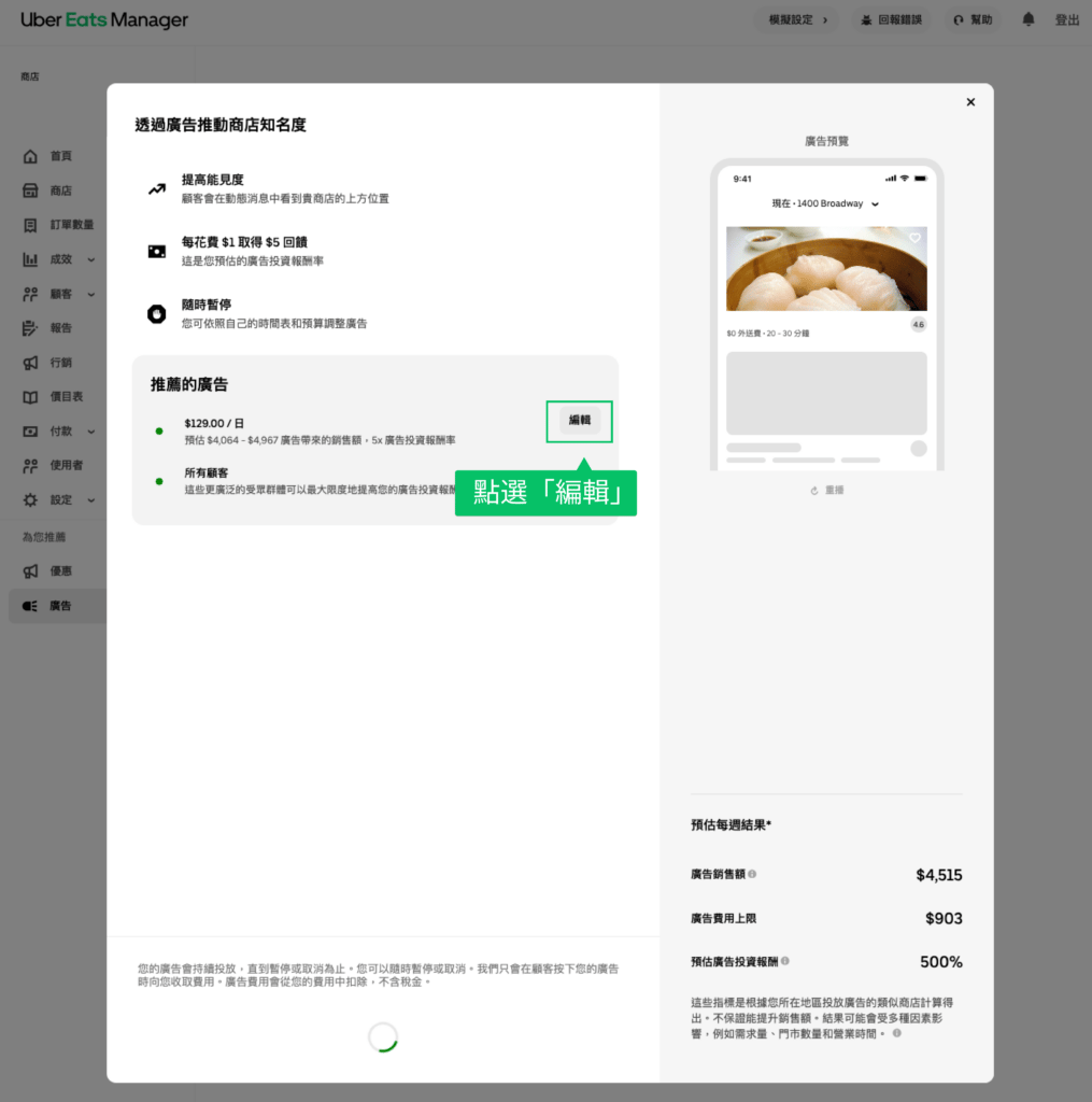 為了能迅速地將您的餐廳分享給最合適的顧客,Uber Eats 於設置贊助廣告功能時,提供各商家夥伴簡易的操作方式。僅需要3分鐘,即可於後台設置完成。無論是增加預算、遇到即時店休或是颱風天,您也可以即時前往後台修改、暫停廣告!