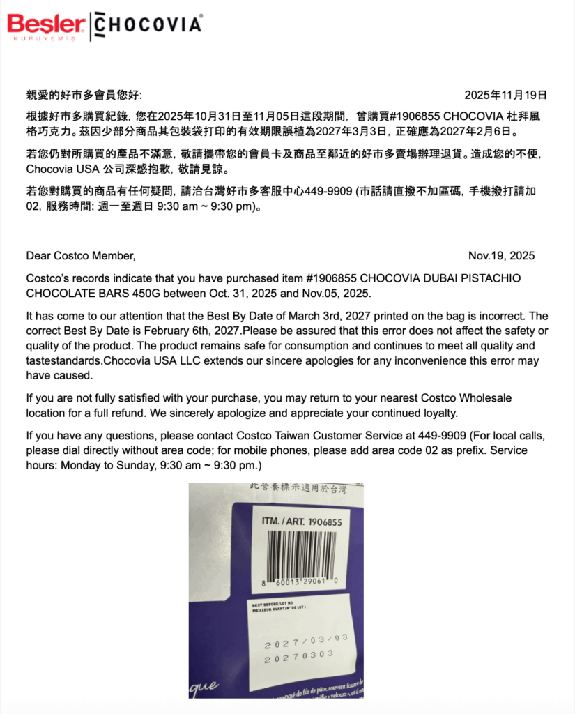 - 🚨 Costco 商品召回通知_杜拜風格巧克力